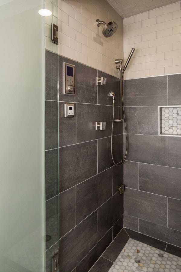 Использование керамической плитки для отделки душевой – наиболее практичный и эстетичный вариант. Даже керамика в нейтральных тонах смотрится эффектнее, если использовать комбинирование изделий разного размера и формы. Сочетание крупной и мелкой плитки «метро» на стенах и мозаики в форме пчелиных сот на полу и в нишах создало интересный дизайн функционального сегмента и ванной комнаты в целом.