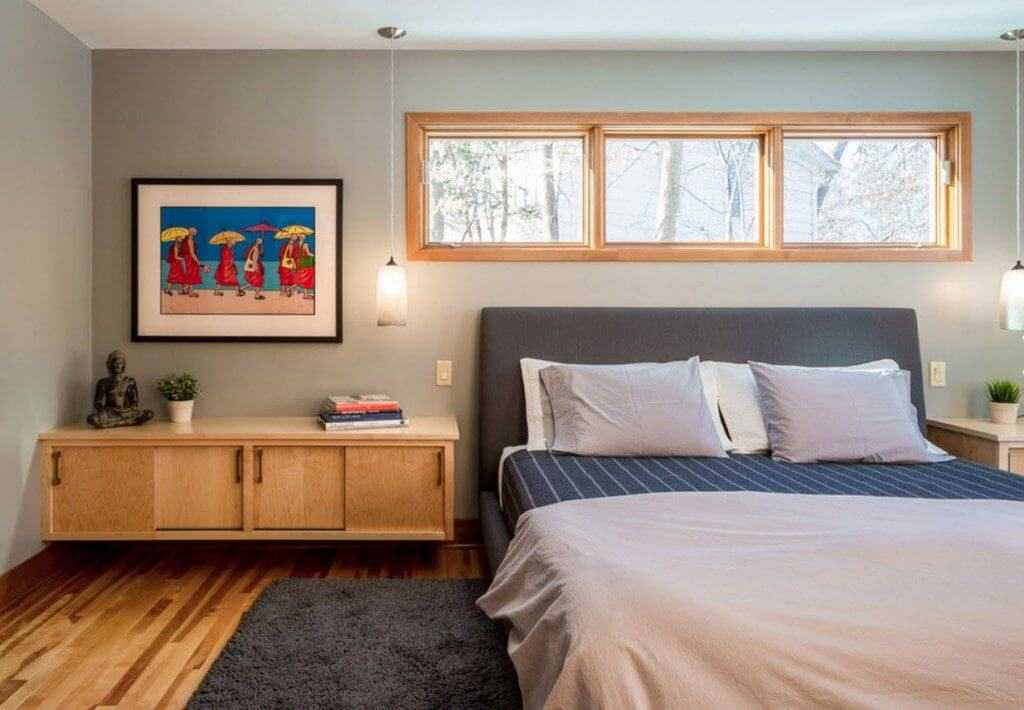 При оформлении спальни ключевыми составляющими становятся цветовая гамма и выбор удобной мебели. Необходимо создать атмосферу, в которой хозяева будут чувствовать себя комфортно, легко и спокойно. Нейтральная цветовая палитра в светлых тонах и приятные древесные оттенки помогут не только приготовиться ко сну, но и ощутить умиротворение. Удобная кровать с мягкой обивкой каркаса и отсутствием острых углов станет прекрасным вариантом для организации спального места для супружеской пары. Подвесные прикроватные тумбы, которые по вместимости можно сравнить с небольшими шкафами, станут не только отличным местом для хранения, но и упростят процесс уборки в комнате для сна и отдыха.